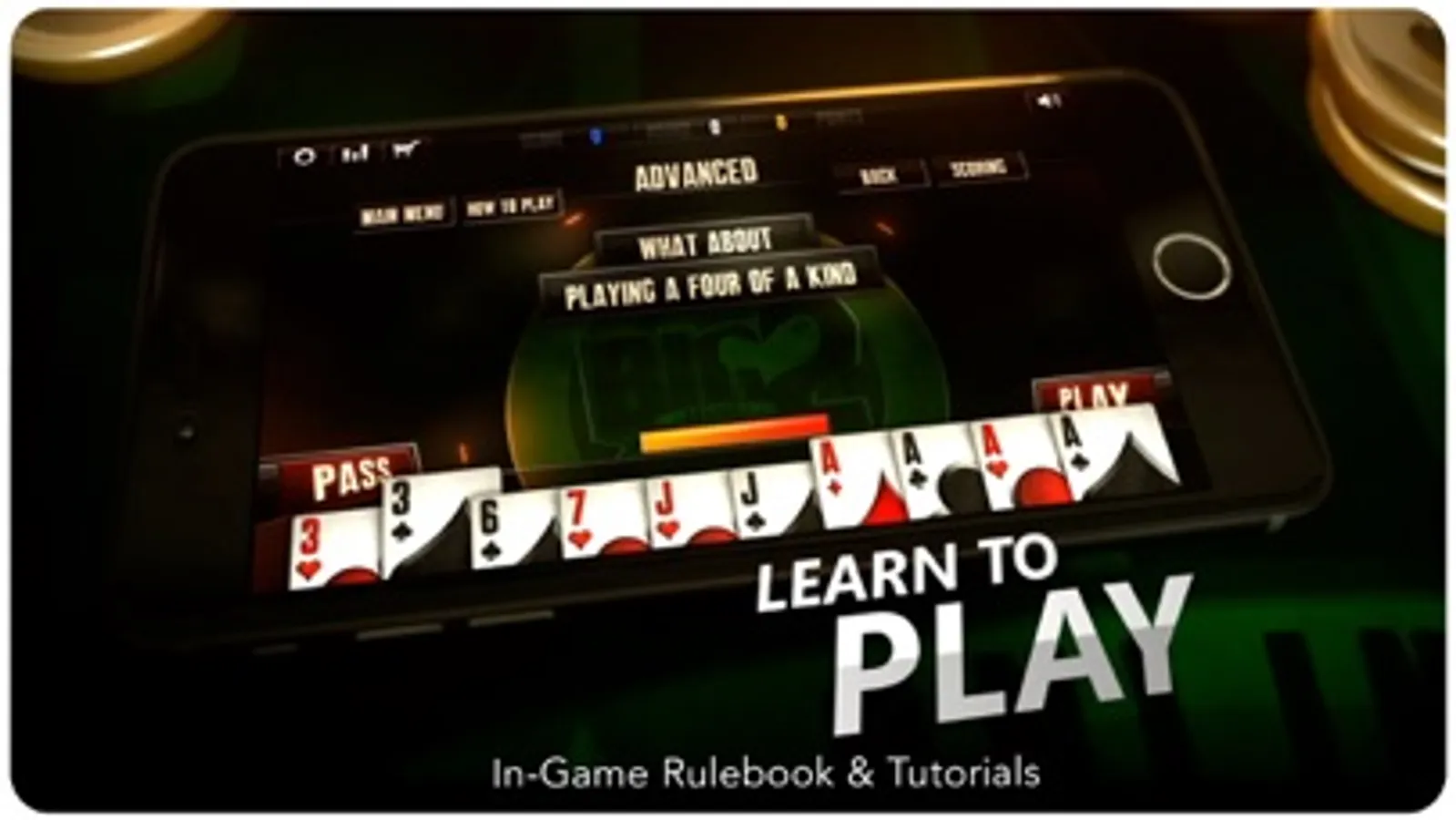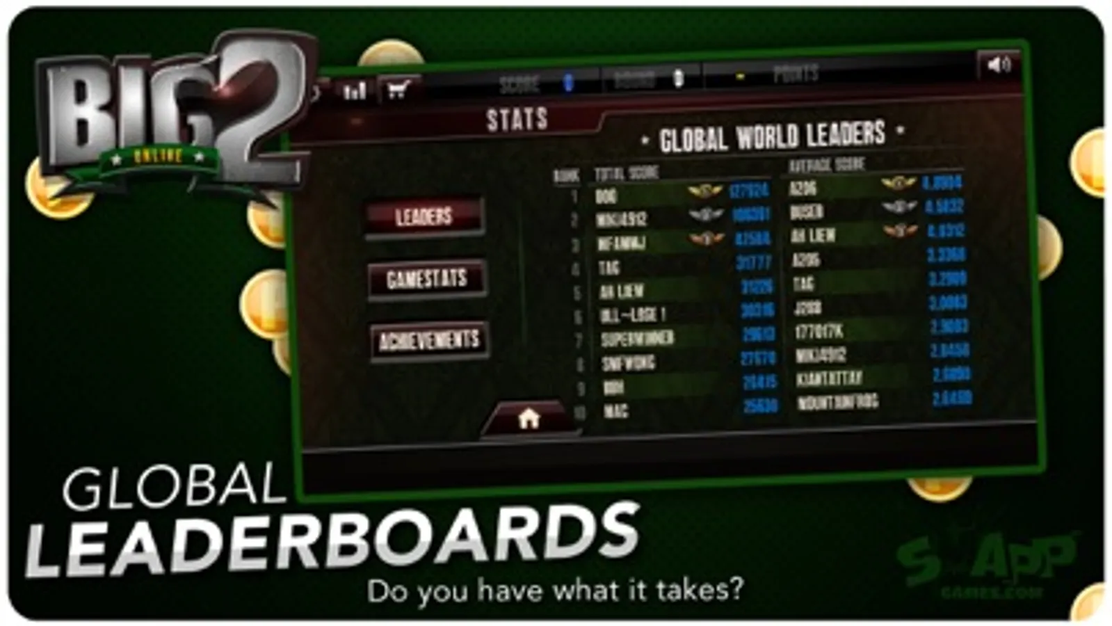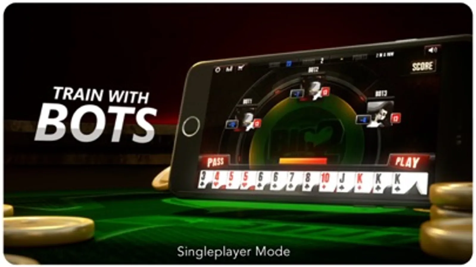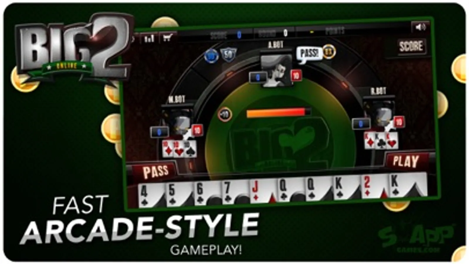 Experience an arcade-like version of Big2! Big2Online expands on this classic card game with Points, Power-Ups, Achievements, Leaderboards, and Single / Multiplayer modes. Connect with Facebook friends and chat with players. While Big2 is most popular in Asia, anyone who loves Poker or card games in general will enjoy this game. Big2Online has a How-to-Play section so that anyone can learn to play!
