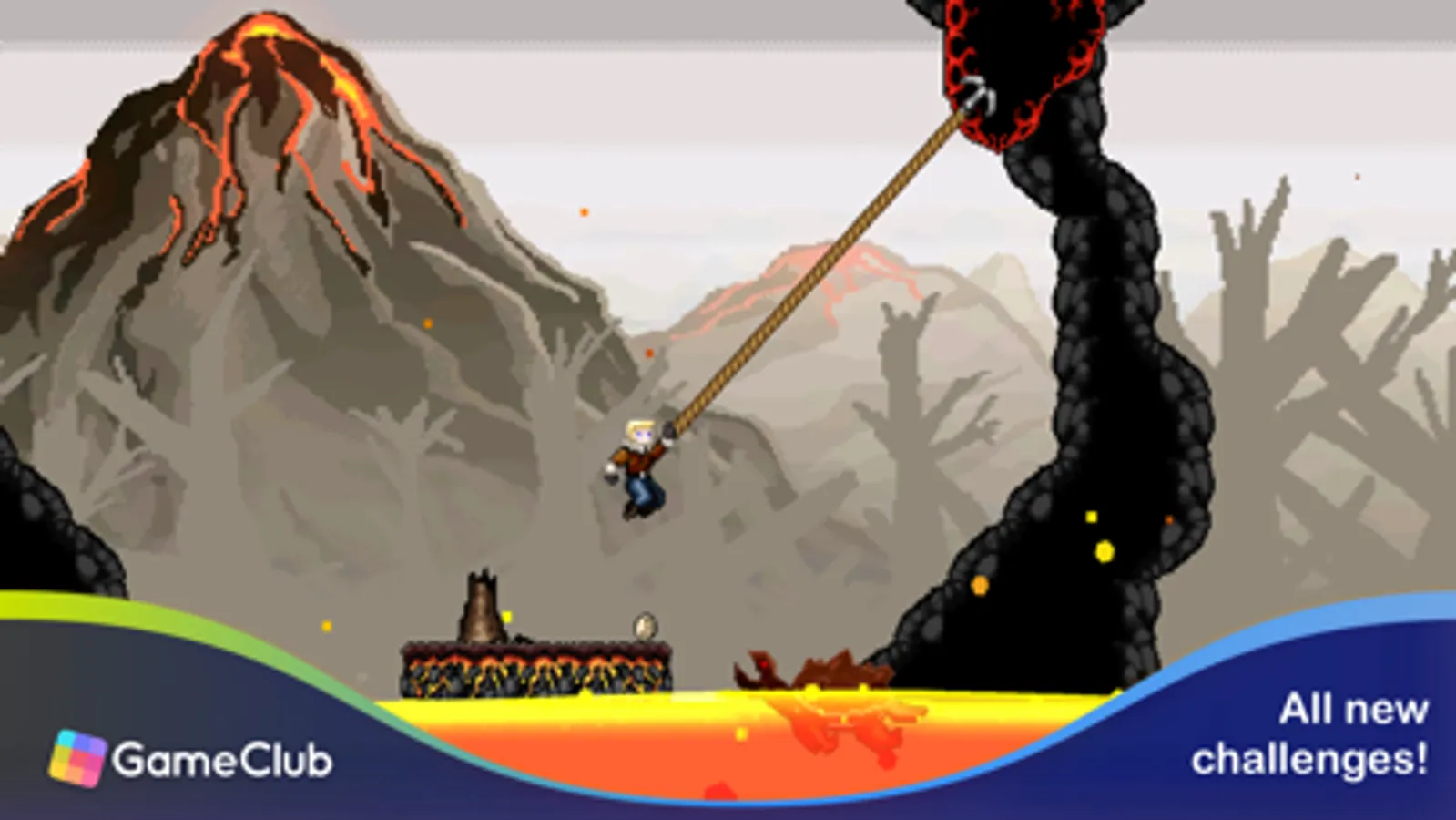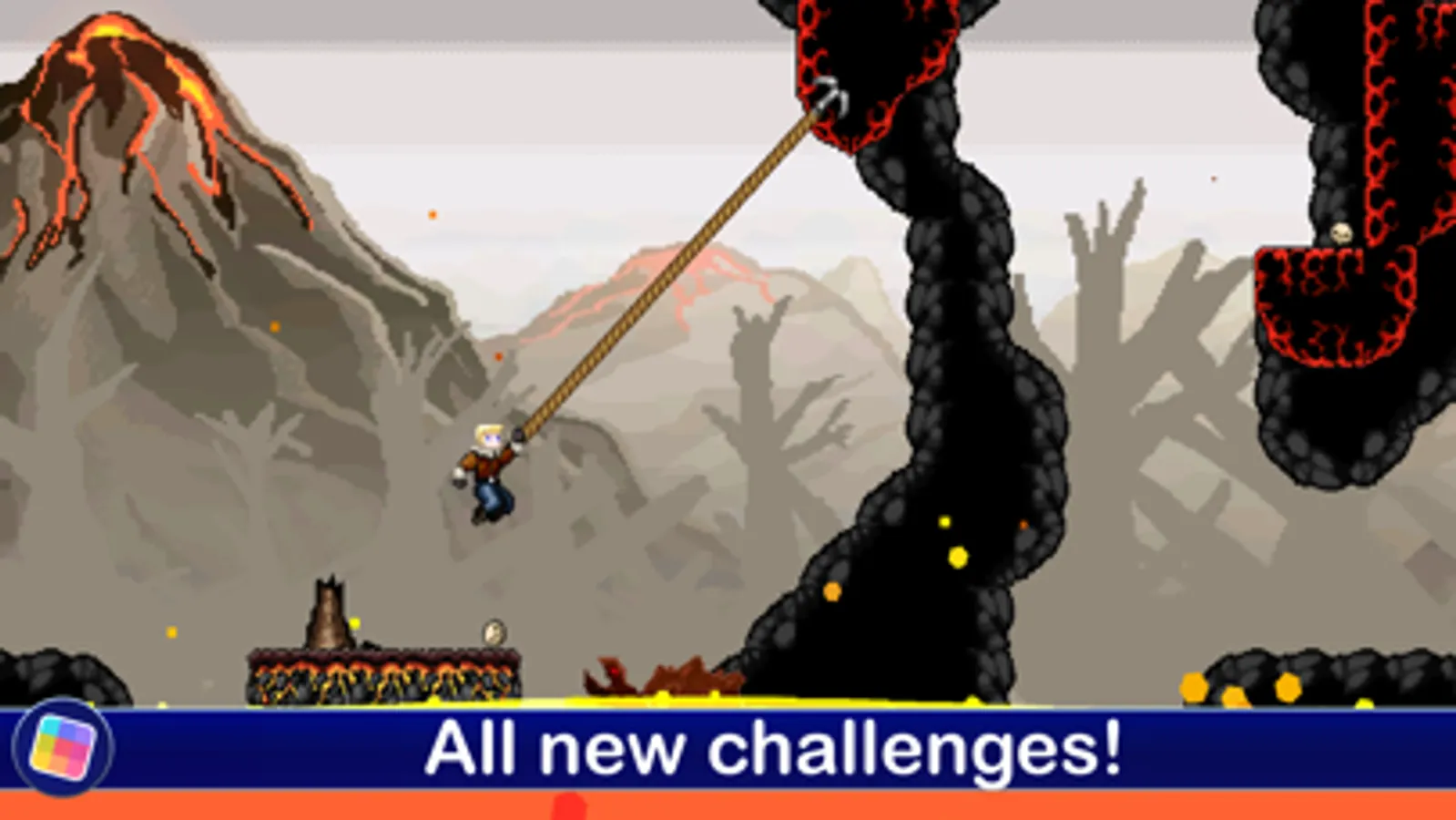 Your grappling hook will let you cover wide expanses, while your rocket boots give you a soaring boost that can pull you out of certain death or help you reach a few mysterious locations. Handy mid-stage checkpoints help you mark your progress through the wildly challenging courses. Try out the all-new endless levels and see just how long you can stay ahead of a terrifying avalanche or the violent blast of an erupting volcano. The key to success comes from maintaining speed and momentum, which requires a careful eye and a very quick hook.