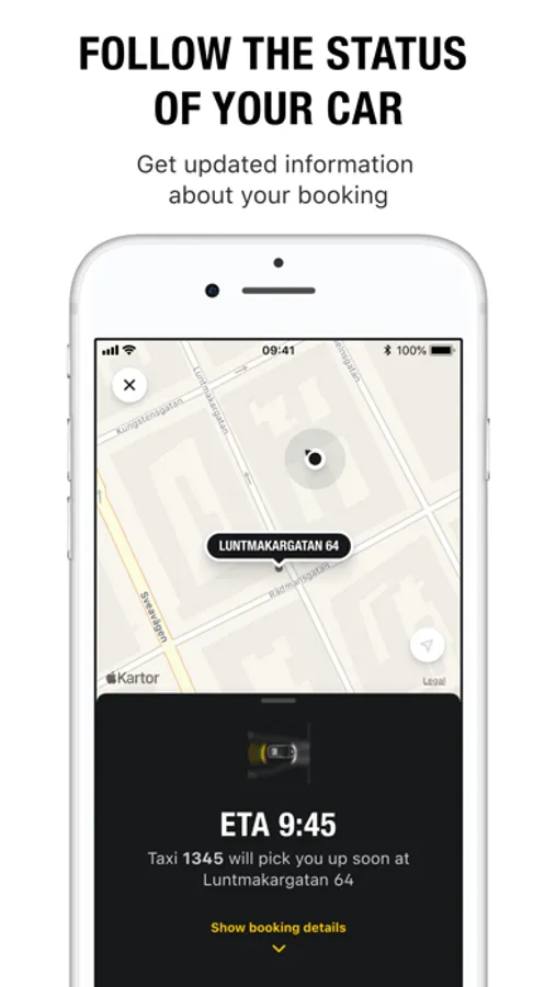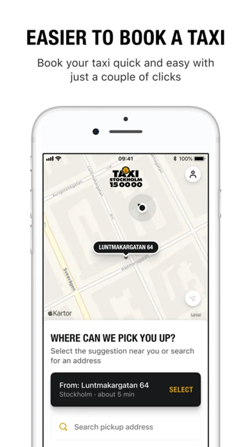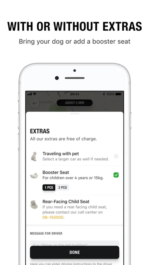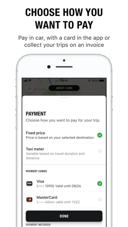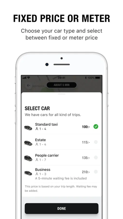 In the app you can book your trip quickly and easily. Choose between regular, business, or large taxis, with or without extras as a child seat or room for your dog. You can also choose to travel for a fixed or metered price, and pay with your card in the app, via invoice through your taxi account, or directly to the driver in the car.
