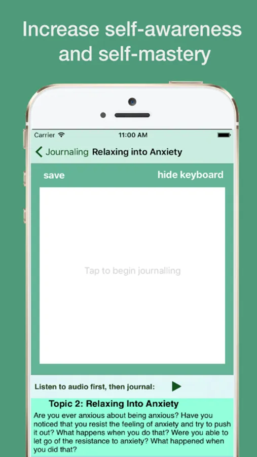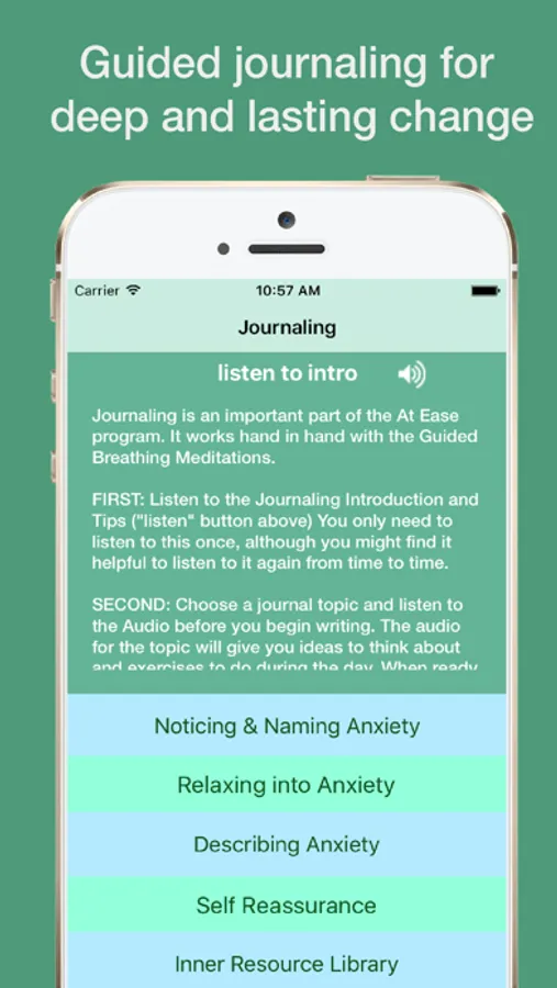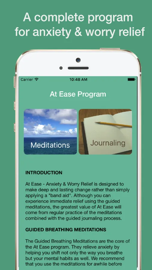 Relax quickly and stop the "Anxiety-Worry Spiral". A unique approach, the app features guided breathing meditations and guided journaling with topics to write on and think about during the day. At Ease is intended to make deep and lasting change rather than applying a temporary “band aid”. You can experience immediate relief using the guided breathing meditations, and realize long term benefits using the program regularly over time.