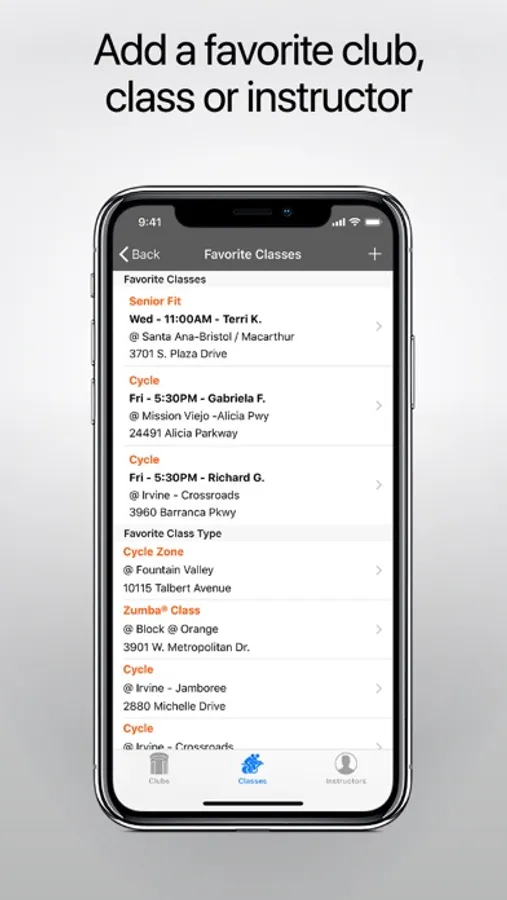 - Create quick access to your Favorite Clubs, Classes, and Instructors