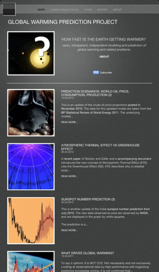News and simulation app on modeling and prediction of global warming and related problems through self-organizing knowledge extraction from public data. It shows forecasts of land air and sea surface temperatures of nine latitudinal bands several months and years ahead, predicts Ozone concentration, Aerosols, Radiative Cloud Fraction, Sun Activity, it discusses and analyzes "What Drives Global Warming?", or it simulates and predicts the Oil price from energy consumption and Oil reserves. The results will be updated and archived as new data are available, and former predictions and trends can be compared with actual data. It is also possible to download modeling software, data and results as MS Excel documents.