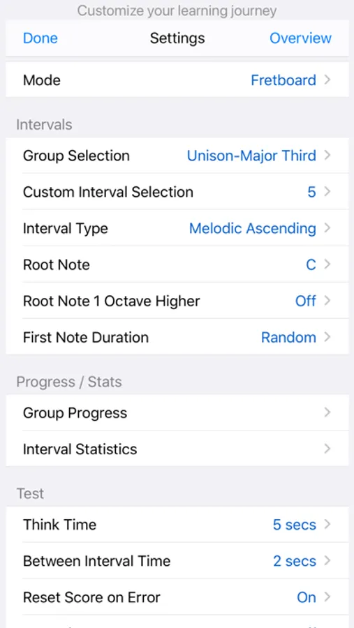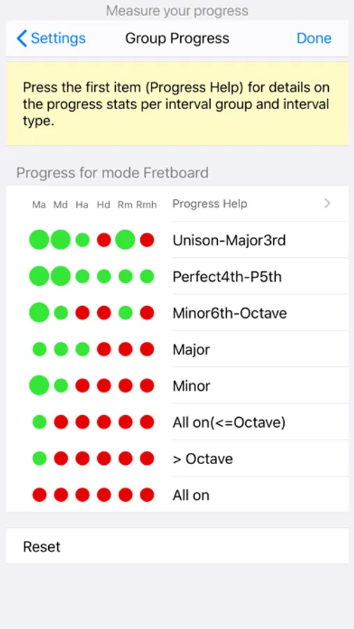 - Intervals are grouped by difficulty level. Each group has 6 progress indicators corresponding to the different interval types (melodic ascending/descending, harmonic ascending/descending, random melodic, random harmonic/melodic).