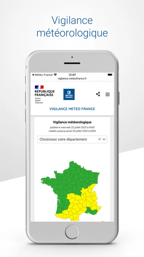 En cas de vigilance, un clic sur la carte donne accès au bulletin national et à la liste des départements en vigilance (jaune, orange ou rouge). Par cette liste, accédez aux bulletins départementaux de vigilance.
