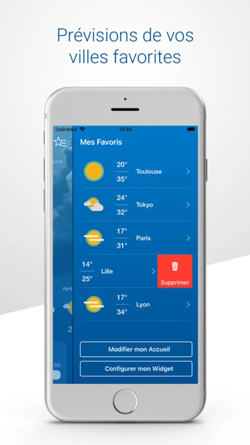 - Accédez au menu des favoris permettant de supprimer des favoris mais aussi de définir la ville de la page d’accueil et du widget (ville géolocalisée ou l’une de vos villes favorites)