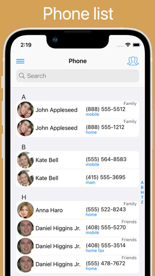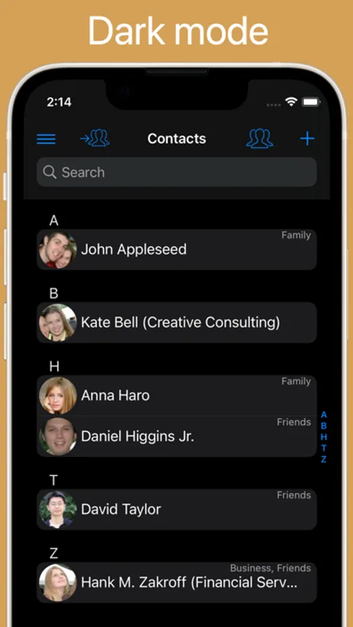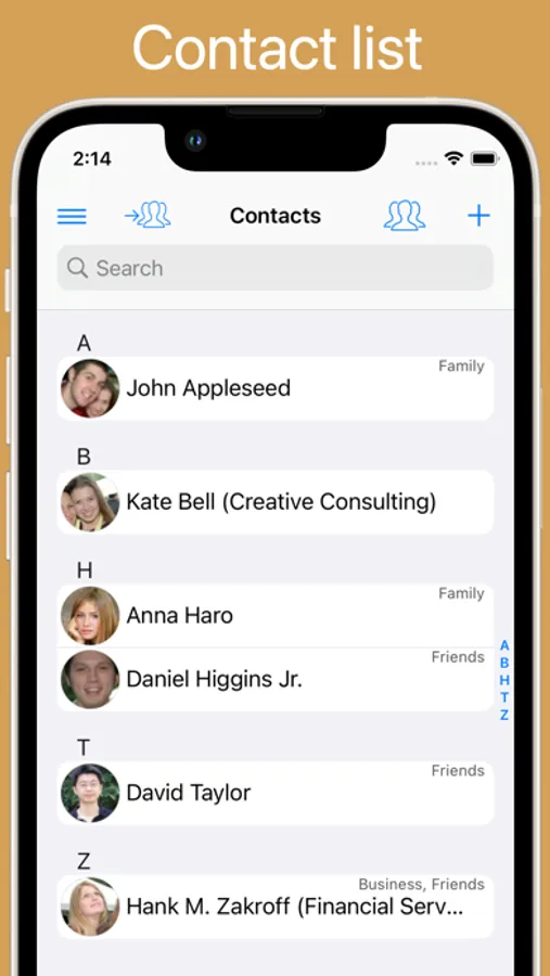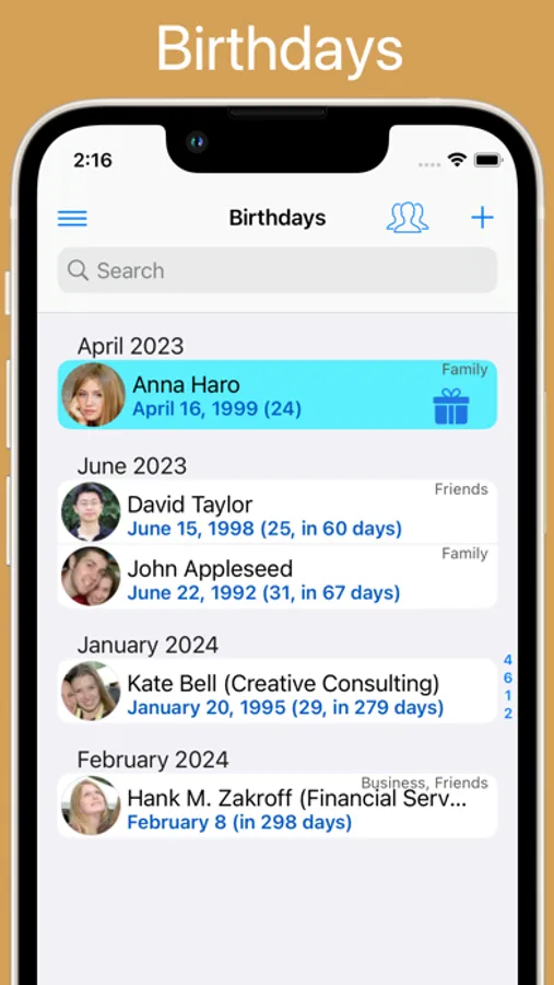 The search function enables you to search for different information within all your contacts on your device. There is also a function to list all birthdays.
