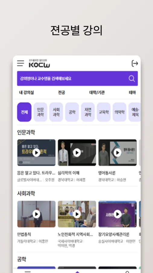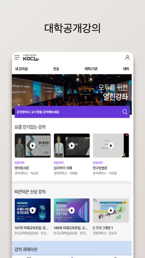 KOCW 홈페이지 또는 앱 접속 후 ① 국내 및 해외 대학의 동영상 강의에 대한 강의명, 교수자(저작자), 제공처, 강의정보에 대한 "키워드 검색" ② 주제 및 제공처에 대한 "분류"를 통해서 원하시는 강의를 찾으실 수 있습니다.