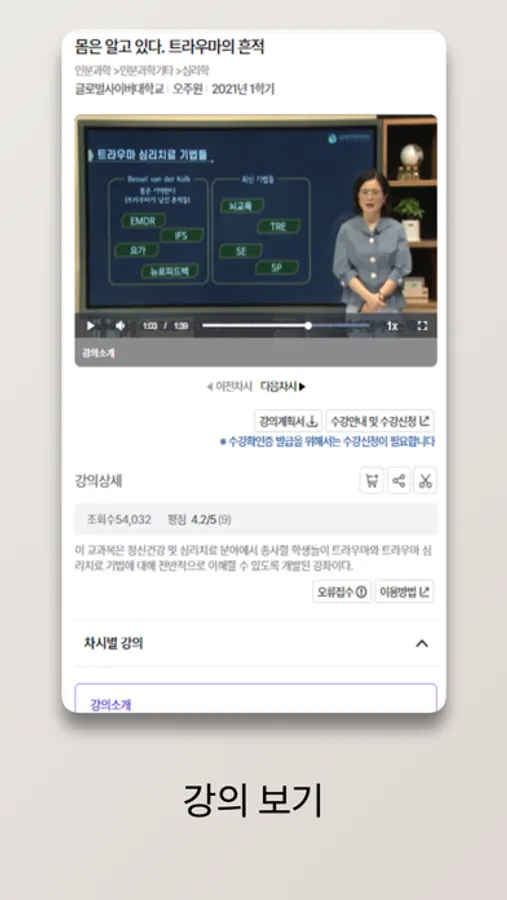 또한 ③ 썸네일과 함께 제공되는 강의 리스트 중 원하시는 "파일을 선택"하시면 바로 동영상에 대한 스트리밍을 제공 받으실 수 있습니다.