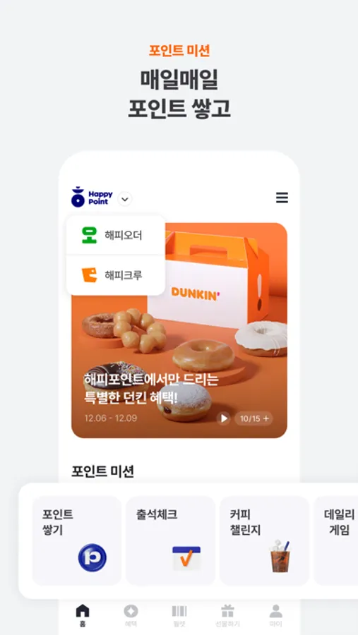 해피포인트는 전국 6천여 개의 매장(파리바게뜨, 배스킨라빈스, 던킨 등)에서 적립/사용할 수 있고, 다양한 제휴 혜택을 누릴 수 있는 생활 속 필수 멤버십 서비스입니다.