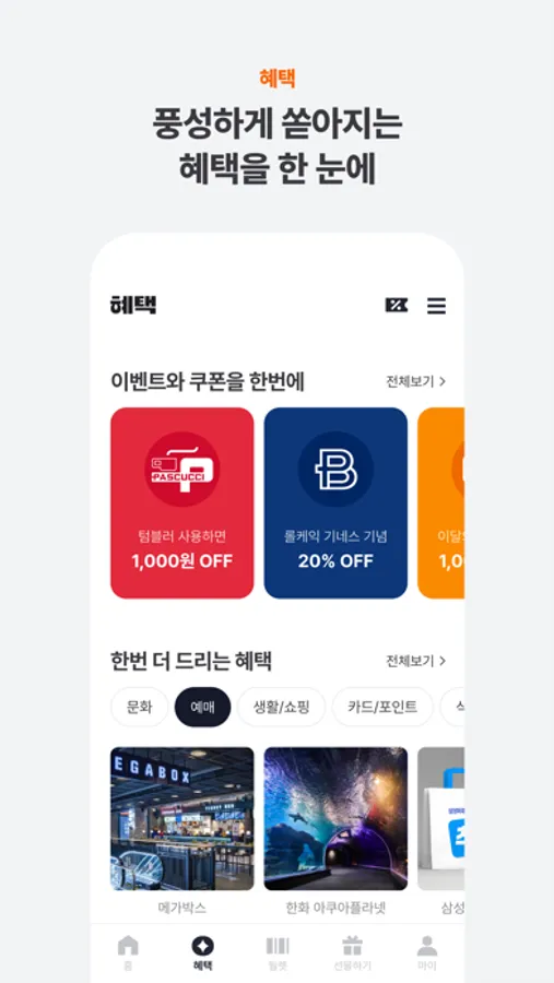이벤트와 쿠폰, 나만의 혜택까지 한 번에 더 편리하게 확인하세요.