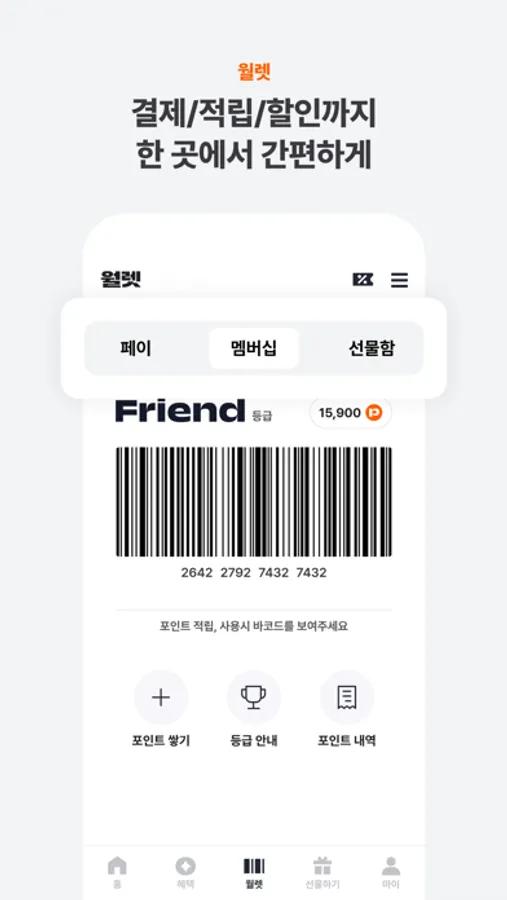 포인트 적립/사용, 쿠폰 할인, 페이 결제까지 월렛에서 더 쉽고 빠르게 경험해 보세요.