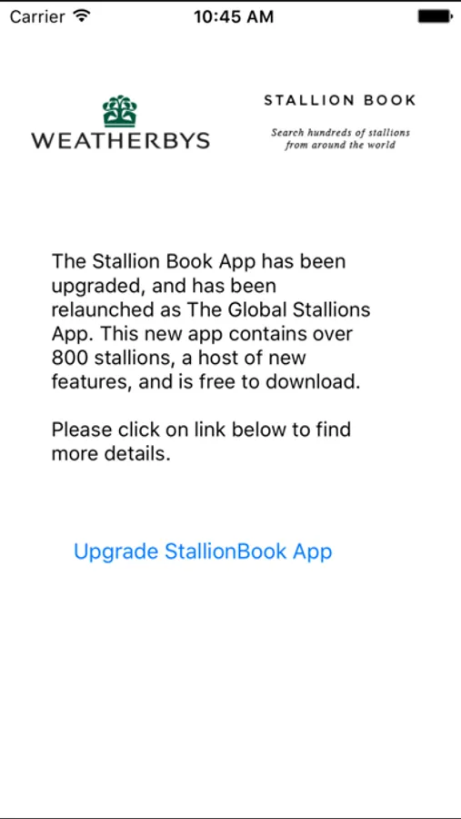 A new page added to indicate that "The StallionBook app has upgraded, and has been relaunched as The Global Stallions App. This new app contains over 800 stallions, a host of new features, and is free to download. A link was given to go to or to upgrade stallion book app from app store."