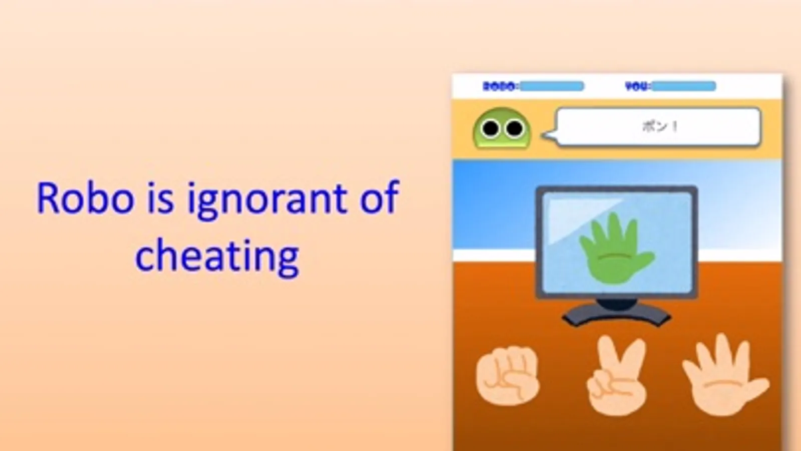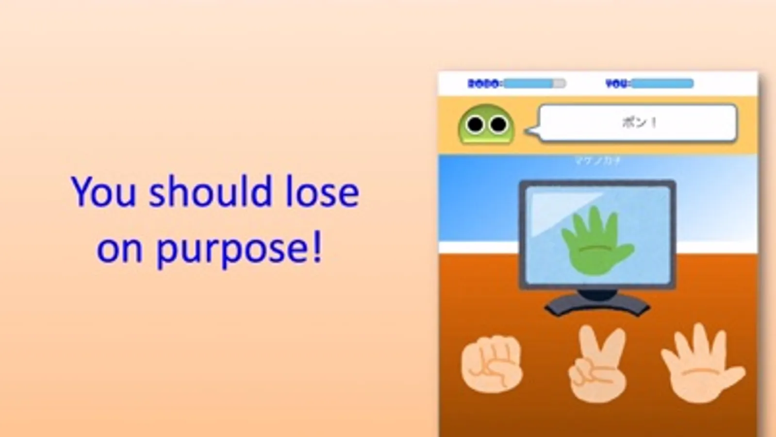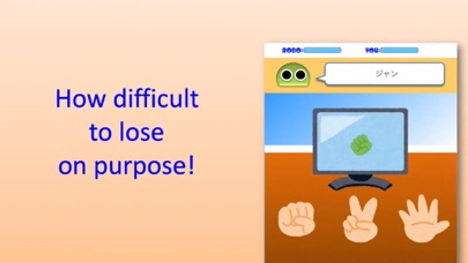 Using Rock-Paper-Scissors, battle with Robo. If Robo says 'to lose', you should tap the button of losing yourself. Wow, it's difficult to lose on purpose..