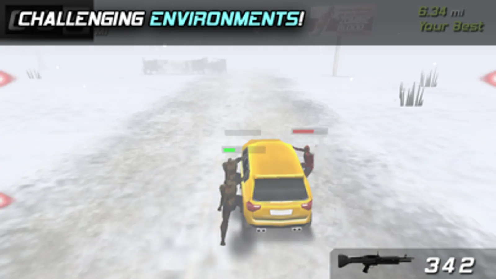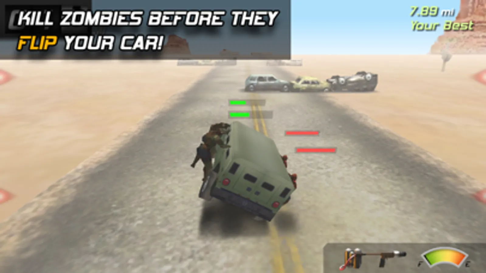 Steer to avoid obstacles all while trying to SMASH latched on zombies into debris - OR - run them down before they can