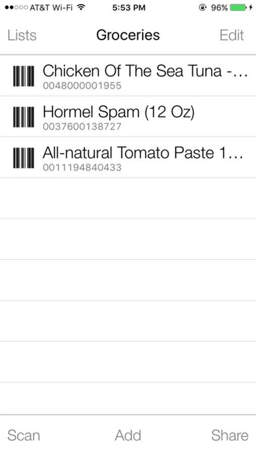 - Create lists of code that you've scanned; edit them, type additional information and share them with others. This is how Robbie notes what items are getting used up and tells Gary what to buy at the store;