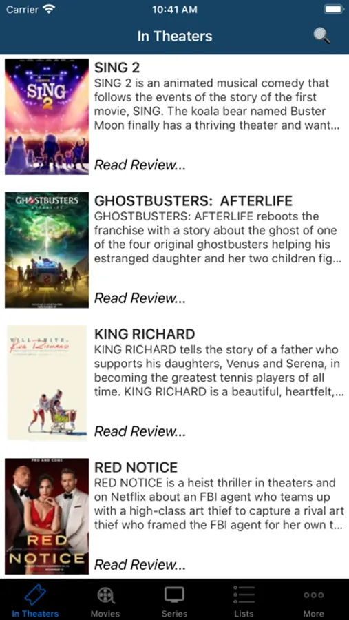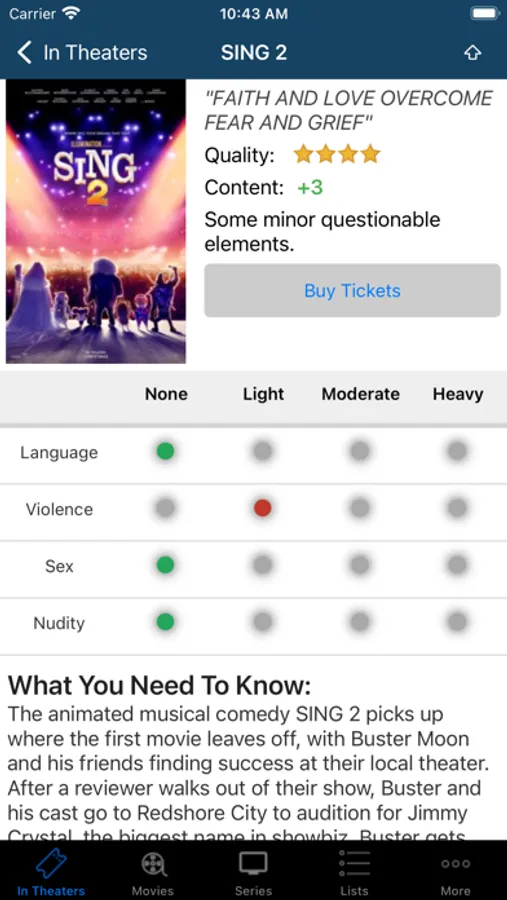 • Review overall movie content and detailed ratings in four categories (language, violence, nudity, sex)