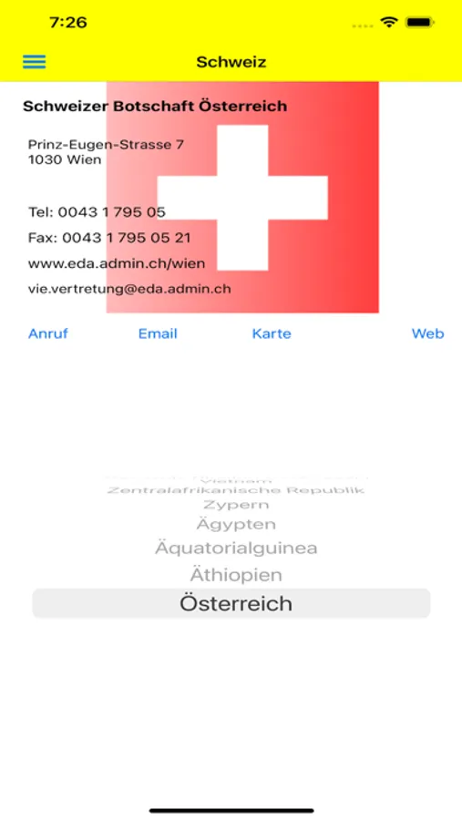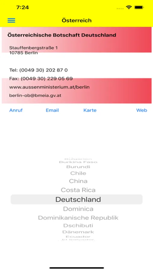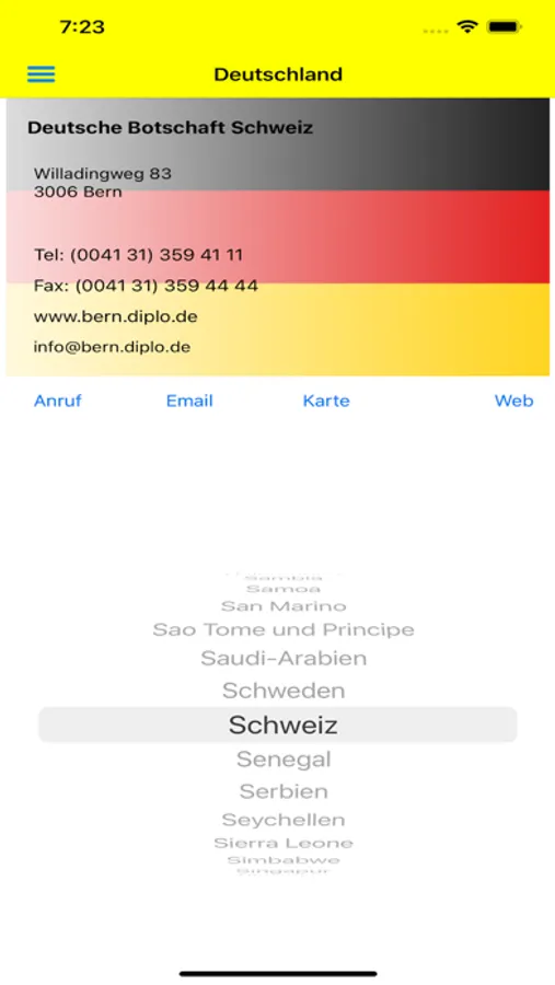 Botschaften D/A/CH beinhaltet alle Botschaften von Deutschland, Österreich und der Schweiz weltweit in einer App.