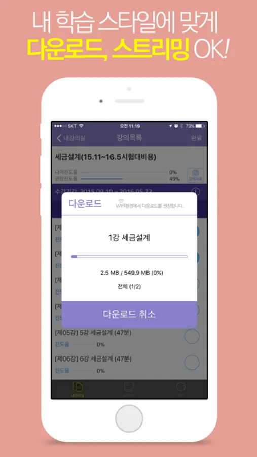 - WiFi를 이용하여 강의를 미리 다운로드 하여 최소한의 데이터로 수강할 수 있습니다. 강의를 바로 수강하고 싶을때는 스트리밍으로 즉시 학습할 수 있습니다.