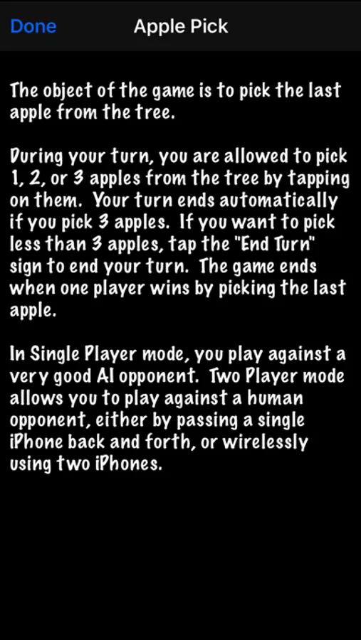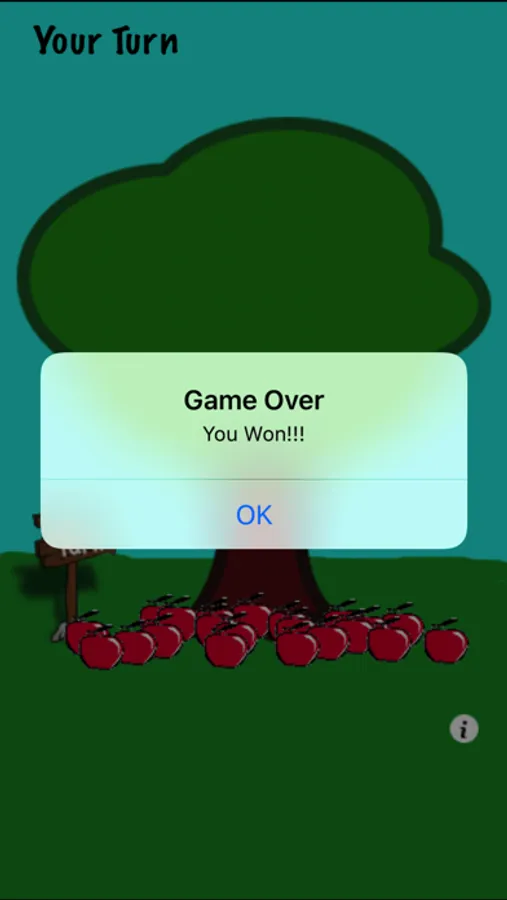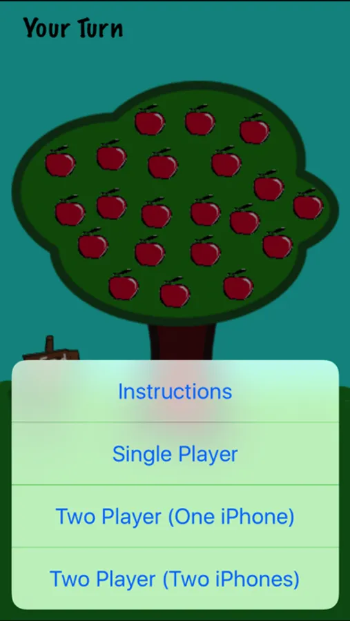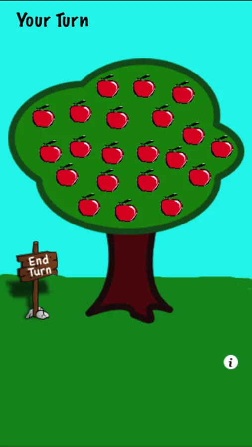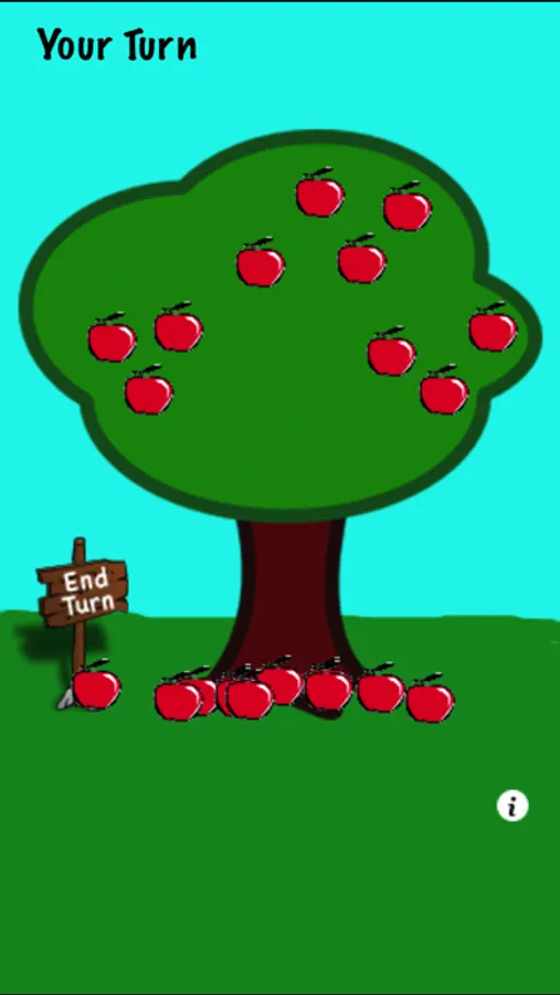Players take turns picking 1, 2, or 3 apples from the tree by tapping on them. Picked apples fall to the ground with a thump! The game ends when one player wins by picking the last apple.