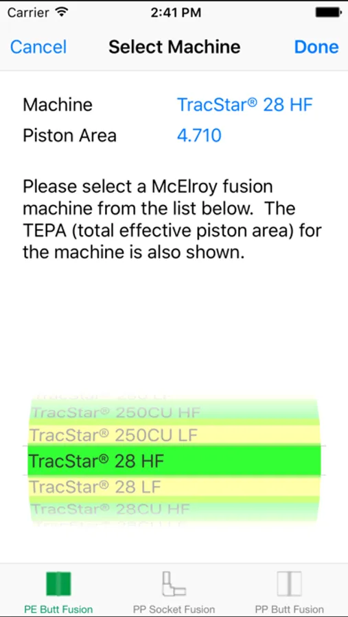 - Easy selection of any of McElroy's hydraulic fusion machines.