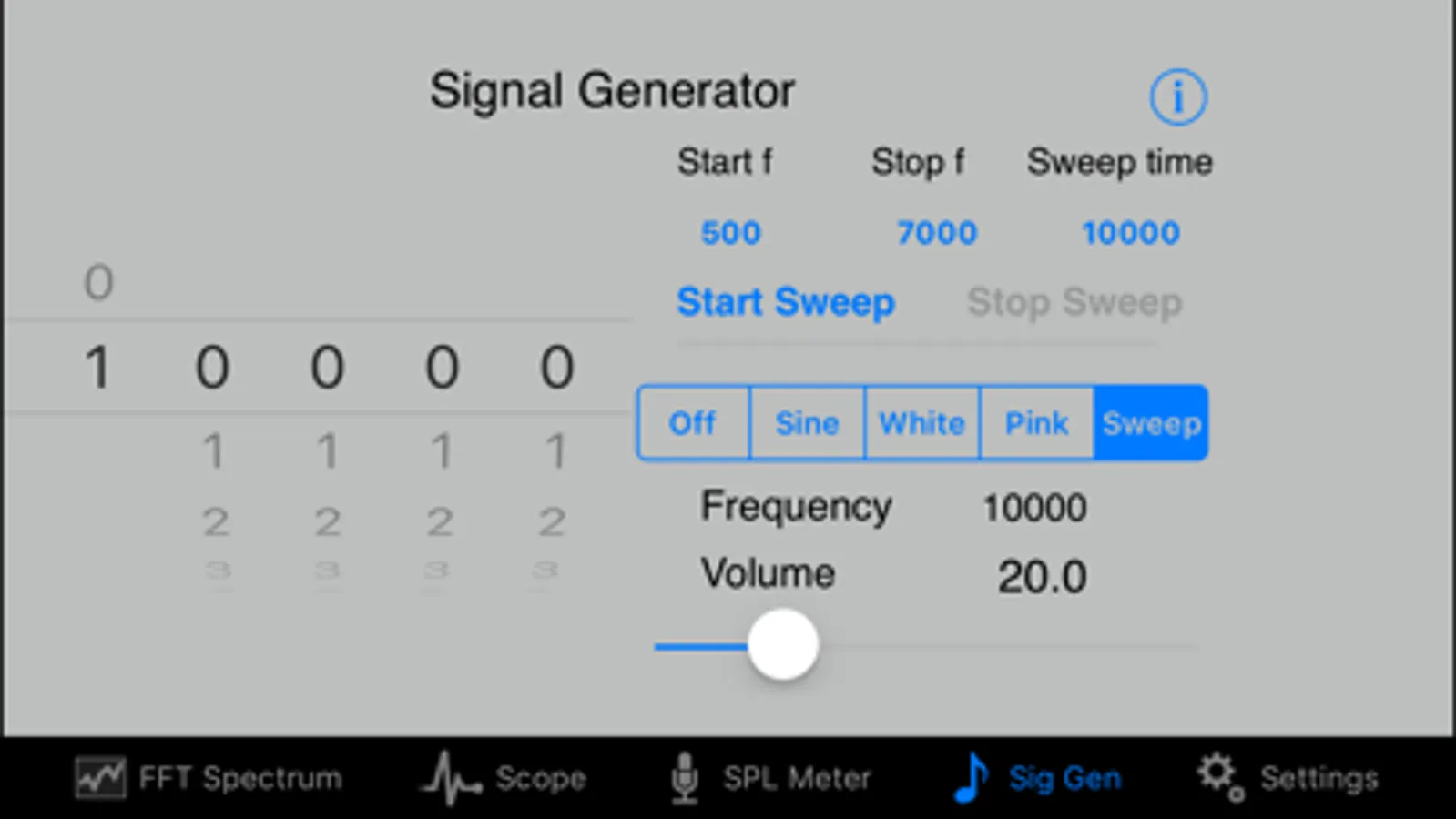 -The Signal Generator provides a sine wave output up to 20,000Hz in 1 Hz steps, along with noise generators for white and pink noise. Sweep generation with In App Purchase