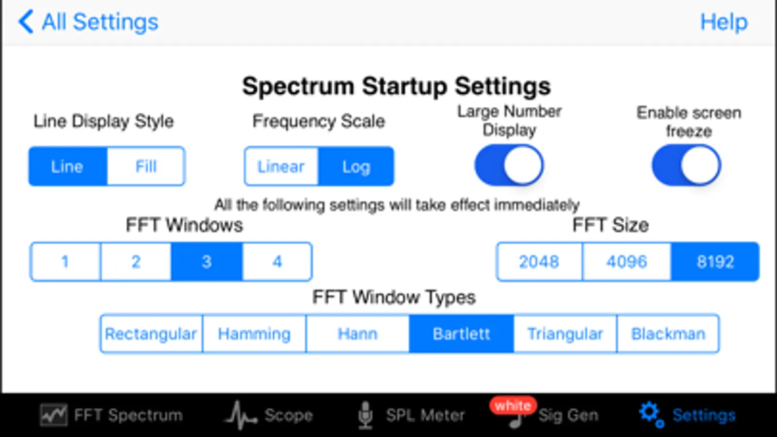 6 different FFT window function types can be selected - Hamming, Hann, Rectangular, Bartlett, Triangular and Blackman.