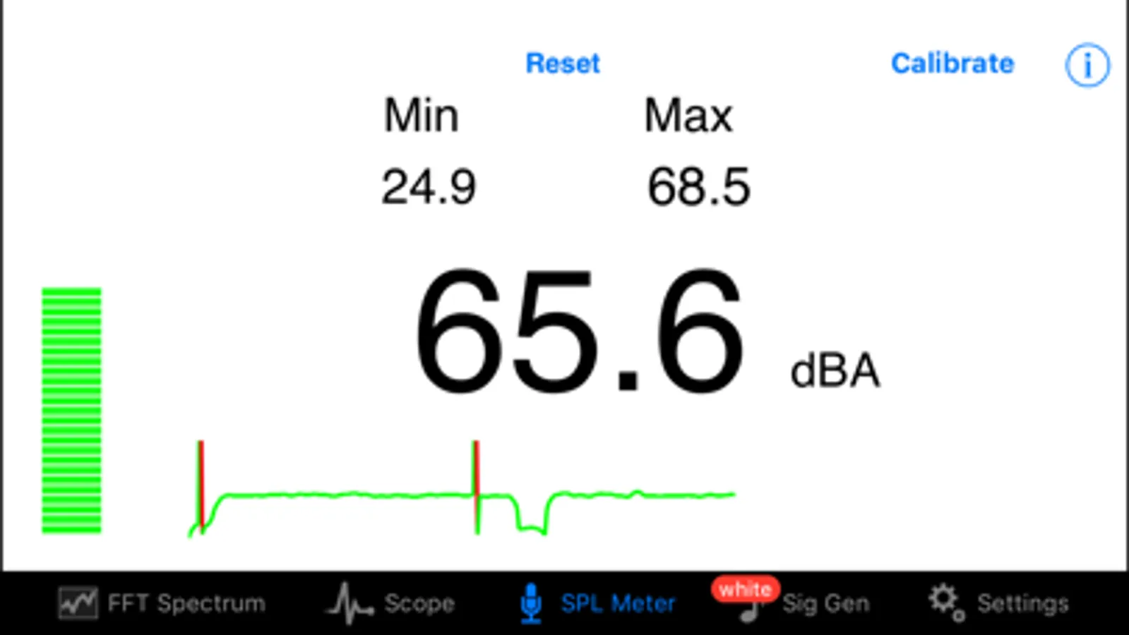 The SPL Meter continuously displays the sound pressure level using an A-weighting, and has resettable minimum and maximum displays also.