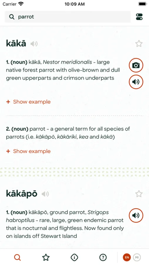 As well as English meanings, it has example sentences with translations for many entries. It even has photographs and audio clips for Aotearoa/New Zealand native fauna and photographs of flora, important people and other items where a photograph will aid understanding.