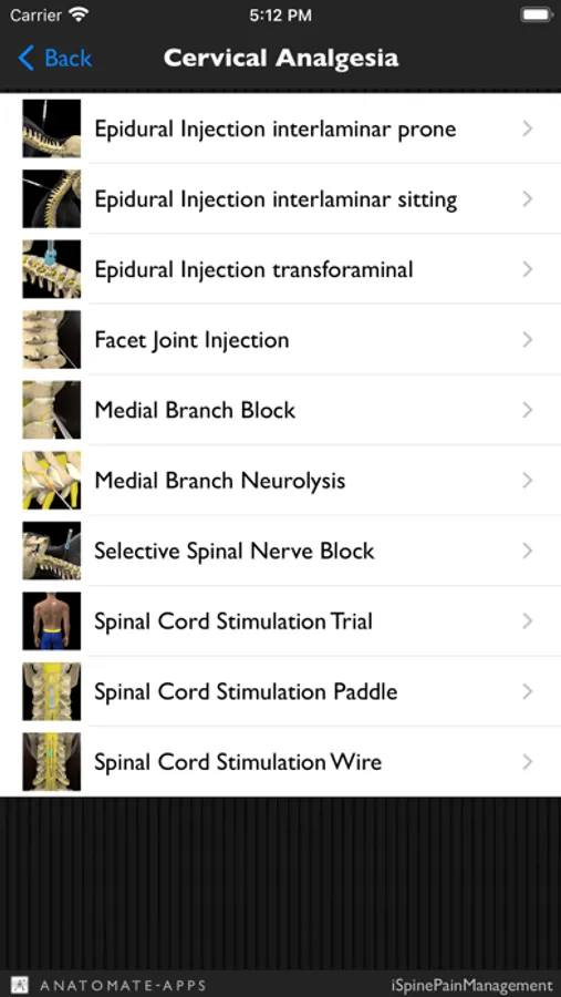 iSpinePainManagement provides accurate spine pain management goal & technique visualizations for informed consent and education. Medical imaging shows real world examples and educational notes cover the indications, alternatives, expectations and complications.