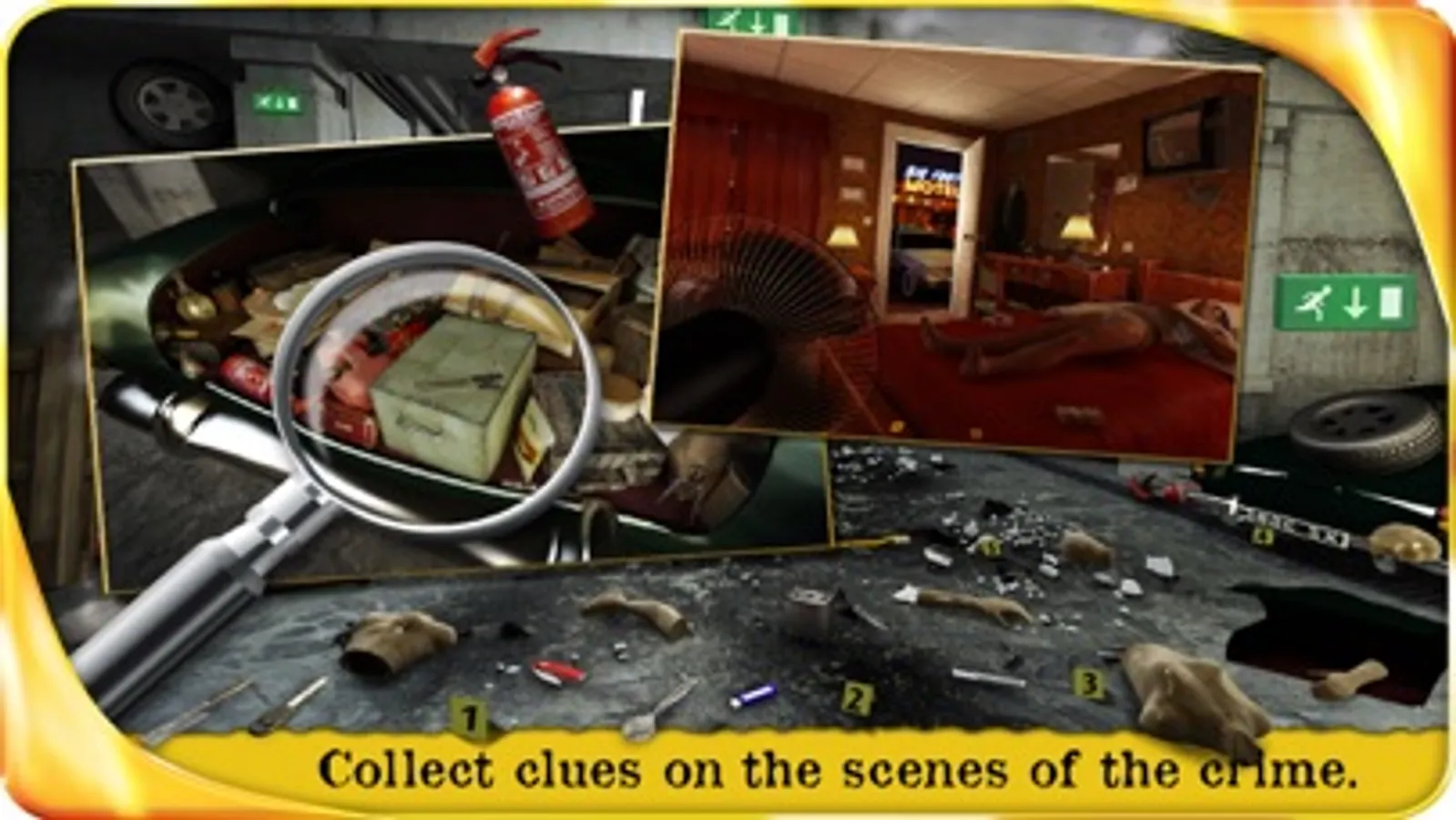 Examine carefully the different crime scenes: a gloomy alley, an underground car park, a disused well, a hotel room, etc. Thanks to their realism and the music, you will feel immersed in the investigation: you will be part of a thriller!