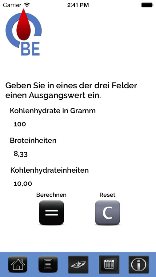 *Kohlenhydrat/BE/KE-Rechner - Dieses Tool ermöglicht dem Nutzer aus den Kohlenhydratangaben der Lebensmittel, die sich nicht in der Datenbank befinden, die entsprechenden Näherungswerte für die Broteinheiten und Kohlenhydrateinheiten auszurechnen.