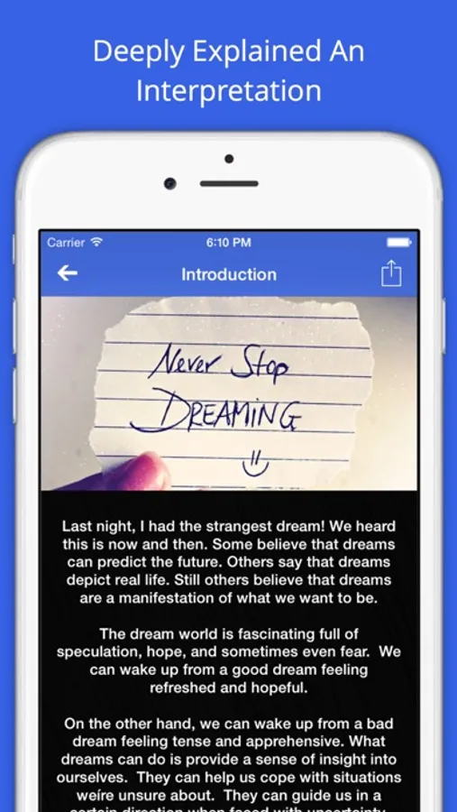 Most of us have had a dream at some point of our lives that made us ask, What did that mean? Do dreams really have a meaning? We can't prove it with science so does that give our dreams a more spiritual side? This application will give answers of all your questions. Not only this, but you can also find amazing information related to dreams, their meaning and interpretations. iDreams Pro application contains below important information related to dreams: