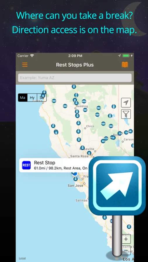 No ads. No logins. No add-ons. Where is the closest rest stop? Where is the next one in your direction? Or one with wifi or a RV dump? The only app that shows you directional access right on the map!