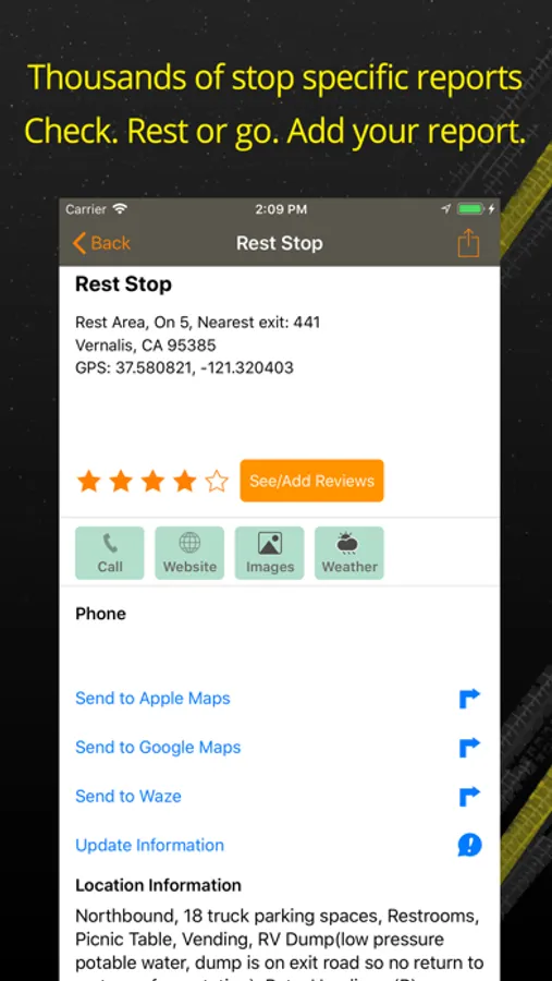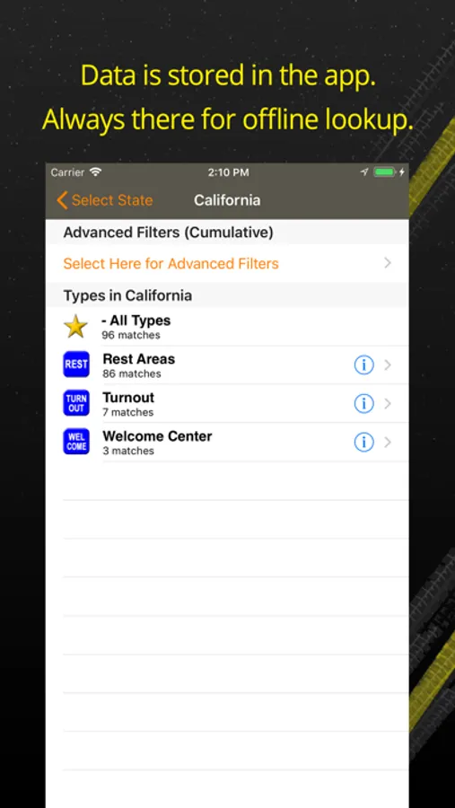 The Rest Stops Plus data is stored on your phone, so calling upon a website for information is not necessary. This is great for improving speed when you’re in rural areas or otherwise out of range for decent service.