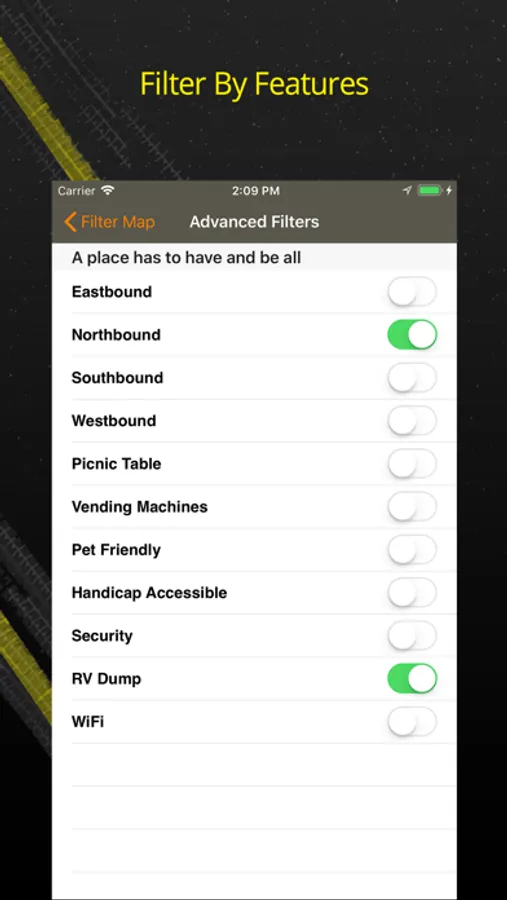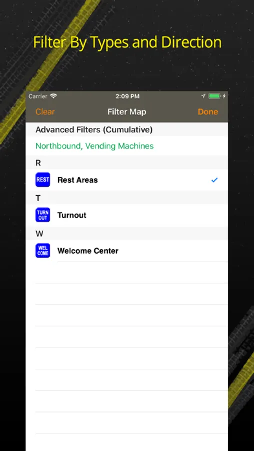 Rest Stops Plus has a unique filtering system. Only heading northbound and don't want to see southbound rest stops that you can't use? Only want ones with a RV Dump or Wifi? You can filter Rest Areas and Turnouts by the direction you are heading or select amenities!