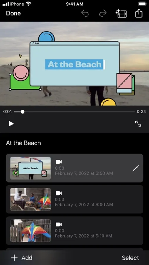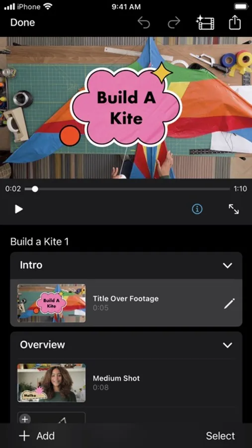 • Select an album or group of videos or images and iMovie will create a video for you—no video editing required—with titles, transitions, and music