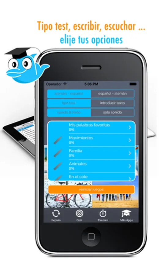 You choose a category and one by one all German words with their Spanish translations are repeated. You can save the words that require more attention as favorite, and practice and test only those words. This option is used to study and learn the German and Spanish words. You can listen to the pronunciation of all words.