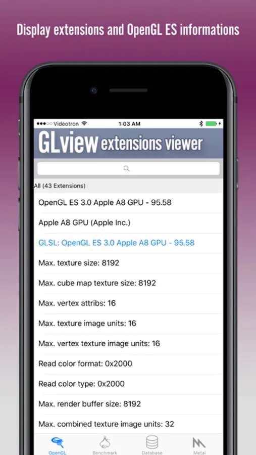 OpenGL Extensions Viewer for iOS displays the vendor name, the version, the renderer name and the extensions for OpenGL ES 1.1, 2.0 and 3.0 and Apple Metal.