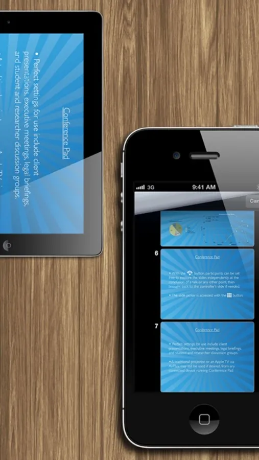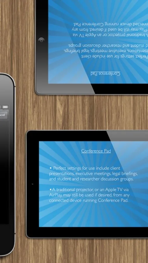 Perfect for making a lasting impression with a high-tech, multi-iPad replacement for the traditional ‘Powerpoint and slide-printouts’ approach at an important meeting or talking to a large auditorium without being stuck behind a lectern or, Conference Pad frees you to travel light and present strong.