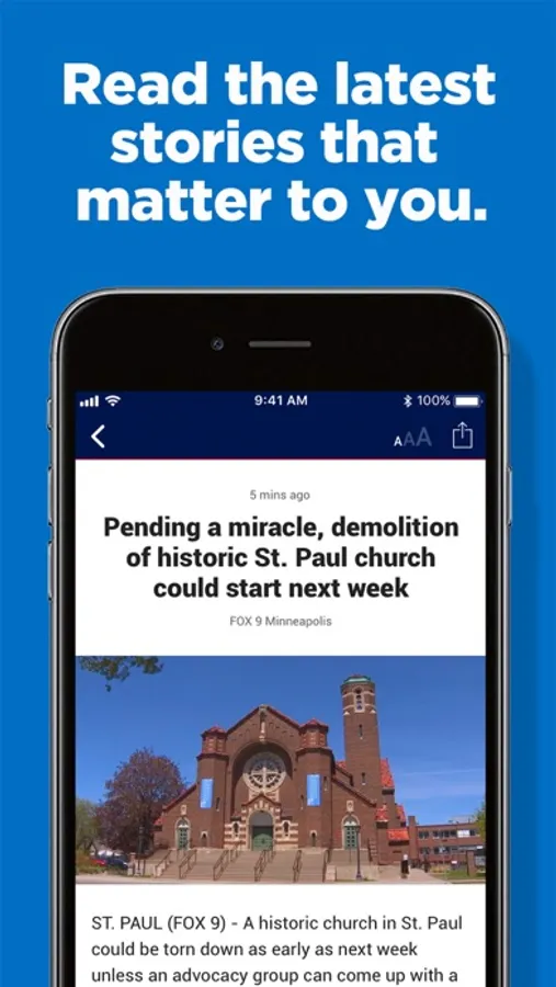 News doesn't wait, why should you? Take FOX 9’s award-winning news everywhere you go! Our app connects you with top stories in and around the Twin Cities — complete with breaking news alerts, live video, and real-time weather forecasts for Minneapolis or St. Paul.