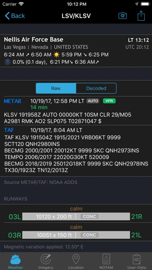 The app features a built-in airport database, which includes airport data like runways, sunrise/sunset, twilight times, moon times, timezones etc.
