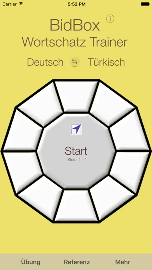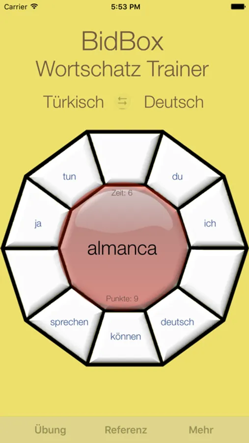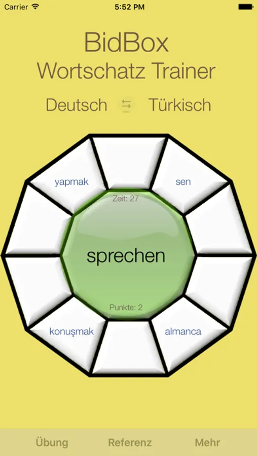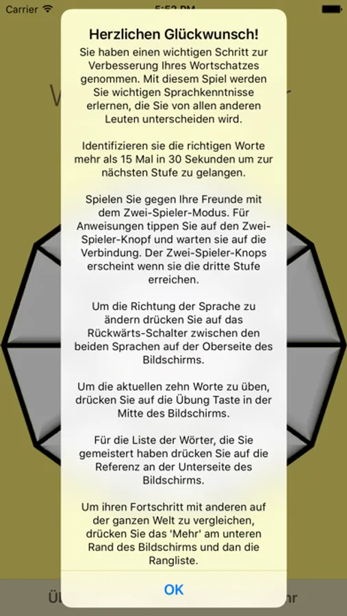 Der Wortschatz Trainer präsentiert ihnen bis zu zehn Worte per Stufe. Um die nächste Stufe zu erreichen müssen sie in 30 Sekunden mindestens 15 richtige Antworten haben. Dieses System erlaubt das Auswendiglernen in einer natürlichen weise.