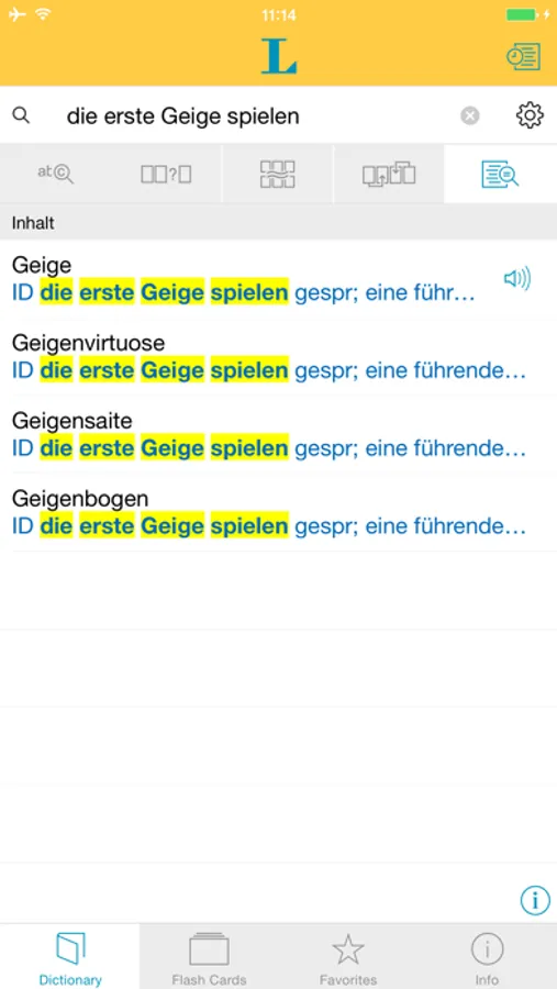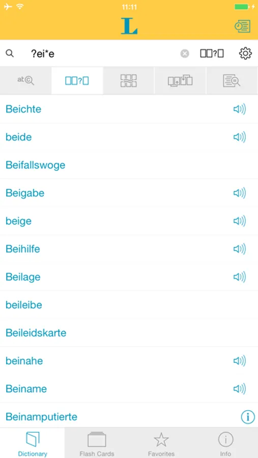 The search history displays the last 100 words you looked up: Access your last searches in the German dictionary by quick-access.