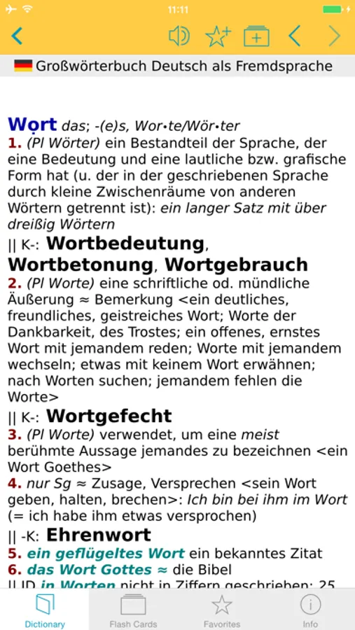 The favourites list allows for quick access of German words you search for frequently: Save important words to your favourites for quick and easy access.