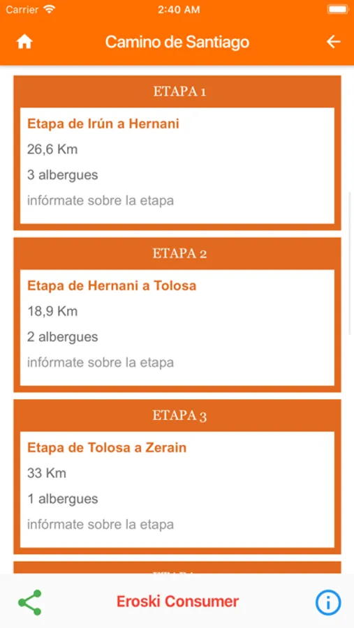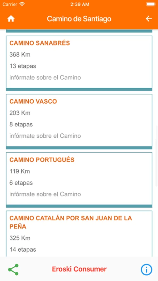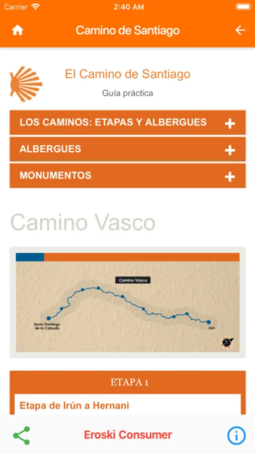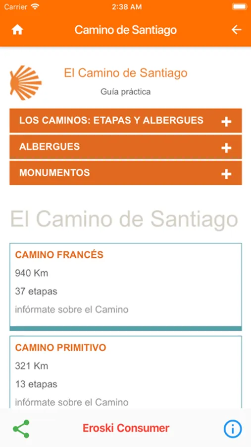 Gracias a la experiencia personal de nuestro especialista, CONSUMER EROSKI ha considerado útil y necesario ofrecer al resto de caminantes los datos clave que esta aplicación te ofrece: los kilómetros exactos, perfiles y qué ver y qué hacer de las etapas de cada uno de los caminos –Francés, Aragonés, Primitivo, del Norte, Vía de la Plata, Vasco, Sanabrés y epílogo a Fisterra- (¡cada año un nuevo camino!); así como fichas con datos prácticos que muestran la oferta de albergues que encontrarás en cada ruta, incluso con fotografías actualizadas; monumentos que podrás visitar allá donde vayas… Esta aplicación es lo único que te hace falta para poder planificar tu camino al detalle, o si lo prefieres, para ir perfilándolo sobre la marcha.