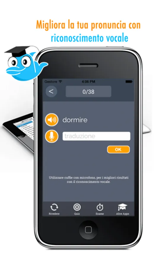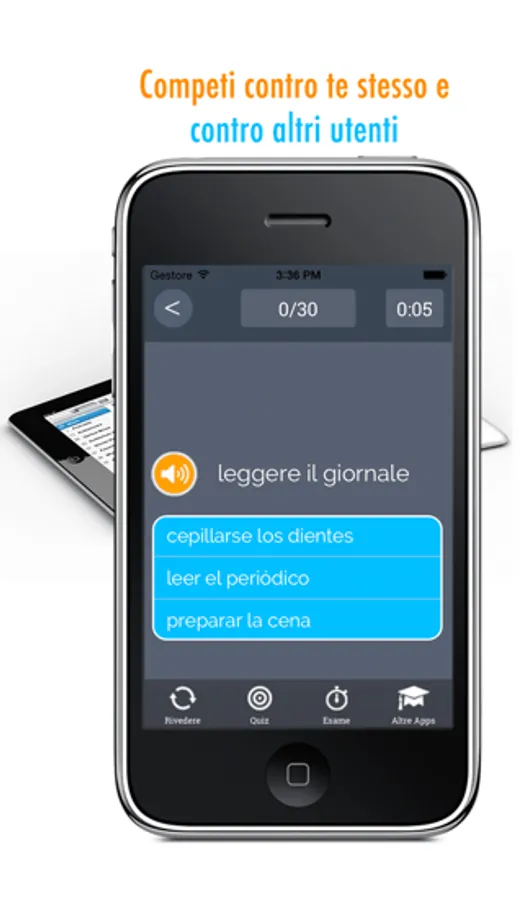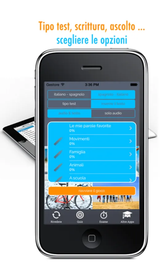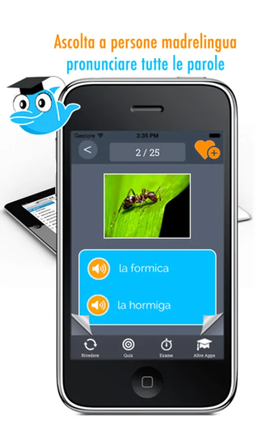 You choose a category and one by one all Spanish and Italian words with their translations are repeated. You can save the words that require more attention as favorite, and practice and test only those words. This option is used to study and learn the Spanish and Italian words. You can listen to the pronunciation of all words.