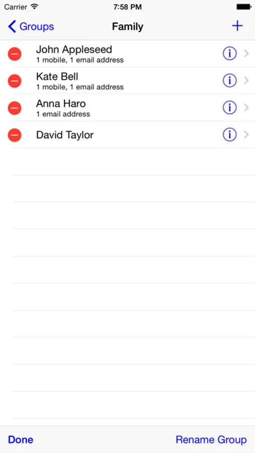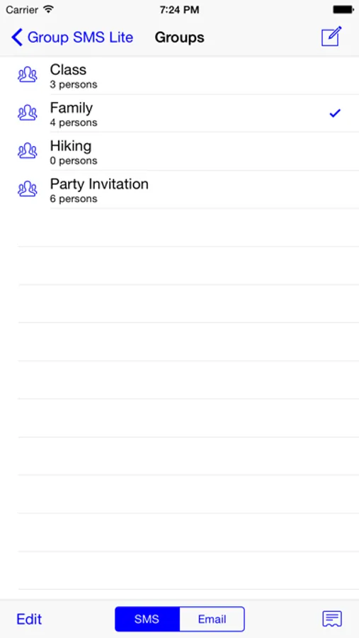 Group SMS Lite will show you the groups that are defined in the Contacts app of your iPhone or iPad. You can also create groups, but since this is the Lite version, you cannot add more than 5 contacts to a group.