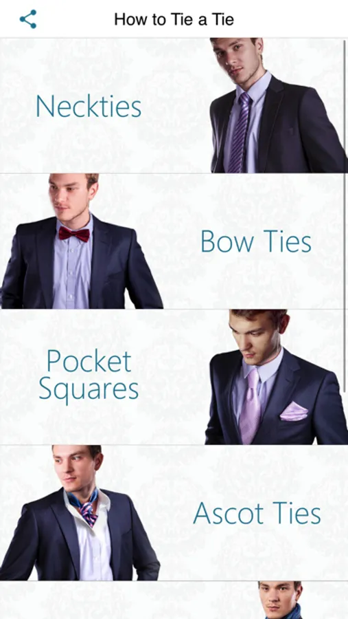 • More than 30 popular necktie knots (Windsor, Eldredge, For-in-Hand, Trinity), bow ties, ascots, pocket square folds and men's scarves.