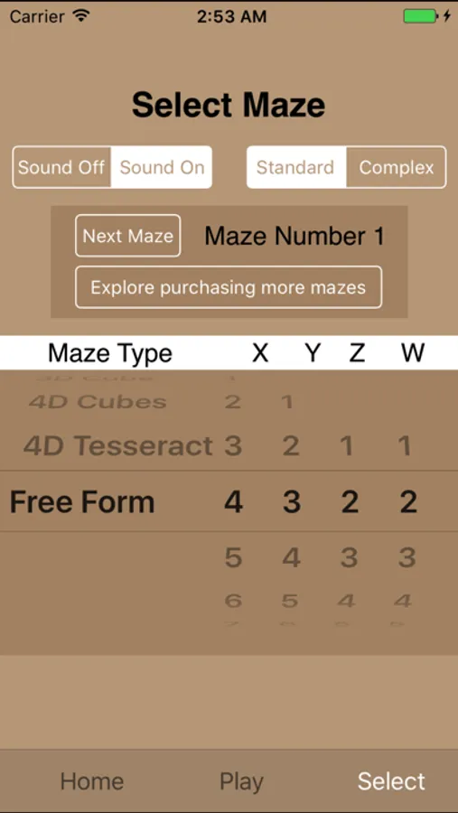 Prior to upgrade, this free version allows 2 mazes of each size and complexity level (e.g. 4 mazes 17x17, 4 mazes 5x2x7x3, 4 mazes, 4 mazes 8x11x2x2, etc.). After upgrade there are 100 mazes of each size and complexity level.