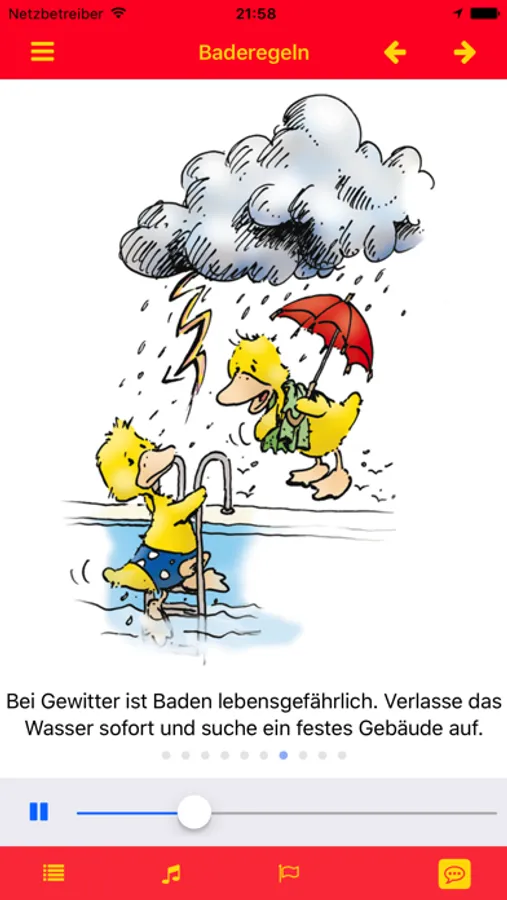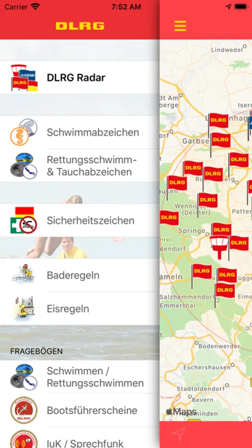 Weitere Inhalte: Baderegeln inkl. Baderegellied, Eisregeln, Anforderungen für Schwimmabzeichen und Rettungsschwimmabzeichen, Sicherheitszeichen, Umkreissuche nach DLRG Gliederungen, Wasserrettungsstationen und Seen auf Seen.de